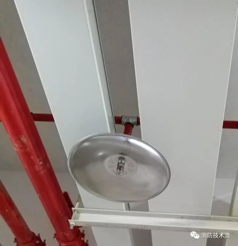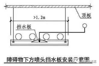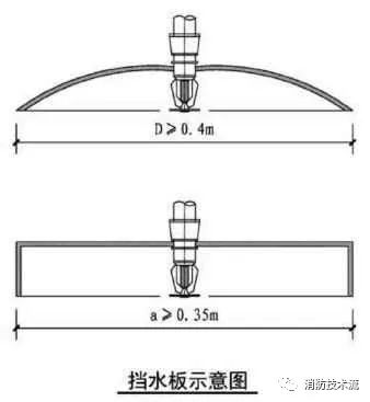 擋水板應為正方形或圓形金屬板,其平面面積不宜小于0.12m2,周圍彎邊的下沿宜與灑水噴頭的濺水盤平齊。除下列情況和相關規范另有規定外,其他場所或部位不應采用擋水板
