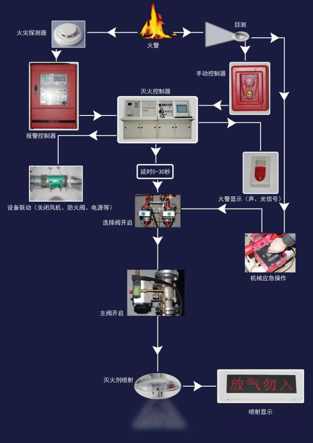 將滅火控制器上的控制方式選擇鍵撥至“手動”位置,滅火系統則處于電氣手動控制狀態。當保護區發生火情時,可按下手動控制盒或滅火控制器上“啟動”按鈕,滅火控制器即發出聲光報警信號,同時發出聯動指令,相關設備聯動,經過一段延時時間,發出滅火指令,打開電磁瓶頭閥釋放啟動氣體,啟動氣體通過啟動管路打開相應的選擇閥和瓶頭閥,釋放滅火劑,實施滅火。