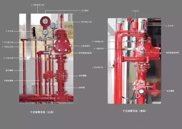 保護區域內發生火災時,溫度升高使閉式噴頭玻璃球炸裂而使噴頭開啟釋放壓力氣體。這時干式報警閥系統側壓力降低,供水壓力大于系統側壓力(產生壓差),使閥瓣打開(干式報警閥開啟),其中一路壓力水流向灑水噴頭,對保護區灑水滅火,水流指示器報告起火區域,另一路壓力水通過延遲器流向水力警鈴,發出持續鈴聲報警,報警閥組或穩壓泵的壓力開關輸出啟動供水泵信號,完成系統啟動。系統啟動后,由供水泵向開放的噴頭供水,開放噴頭按不低于設計規定的噴水強度均勻噴水,實施滅火。