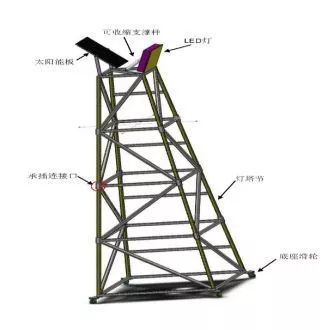 一種可移動(dòng)式太陽(yáng)能施工照明燈,包括一個(gè)可移動(dòng)式燈塔架、太陽(yáng)能蓄電池板及LED燈,每個(gè)燈塔架包括由一個(gè)可移動(dòng)底座、4到6個(gè)可組裝式燈塔節(jié),所述可組裝式燈塔節(jié)每個(gè)高1m,上下成椎體,最大燈塔節(jié)邊長(zhǎng)為1米,最小燈塔節(jié)邊長(zhǎng)為0.4米,可移動(dòng)式底座由4個(gè)萬(wàn)向輪組成,每個(gè)萬(wàn)向輪均設(shè)置鎖定裝置,移動(dòng)時(shí)將鎖定裝置解鎖方可移動(dòng)。