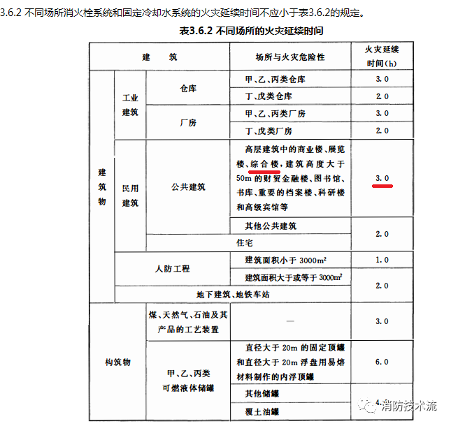 我們還要確定題干中建筑的火災延續時間,根據《消防給水及消火栓系統技術規范》的規定,該類建筑的火災延續時間應為3.0h。參見下圖: