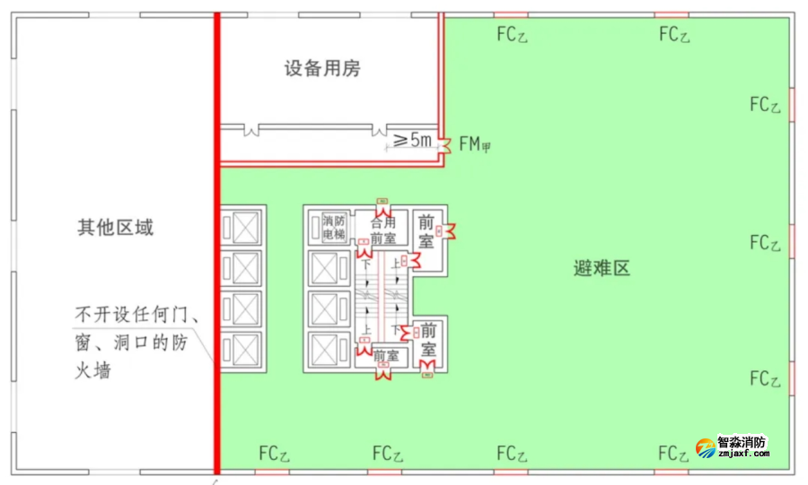 原則上,當(dāng)避難層的避難區(qū)和設(shè)備用房的面積較小時,可將避難層的局部區(qū)域作為其他功能,但應(yīng)采用不開設(shè)任何洞口的防火墻分隔,避難區(qū)應(yīng)至少有兩個面靠外墻,參見【圖示】。在實際應(yīng)用中,這種處理方式主要適應(yīng)于住宅建筑,說明如下: