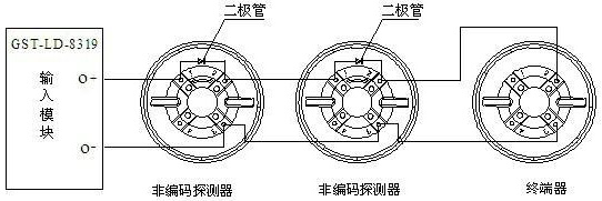 GST-LD-8319輸入模塊與非編碼探測(cè)器串聯(lián)連接時(shí),探測(cè)器的底座上應(yīng)接二極管1N5819,且輸出回路終端必須接GST-LD-8320或GST-LD-8320A終端器,終端器可當(dāng)探測(cè)器底座使用,即在此終端器上可安裝非編碼探測(cè)器,其系統(tǒng)構(gòu)成圖如圖2: