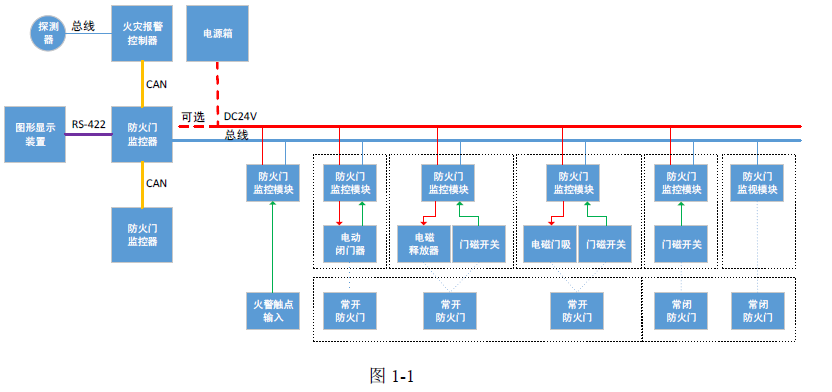 注:本圖僅作為防火門監控系統組成的示意圖,不同監控器的端口、DC24V 配置不同,具體請參考各產品的主要技術指標部分。