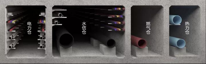 采用雙倉布置配套設(shè)施,城市電力管線、通信管線位于一個倉位,供水管道、中水管道、供熱管道位于一個倉位。