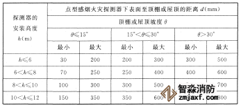 10、鋸齒形屋頂和坡度大于15度的人字形屋頂,應在每個屋脊處設置一排點型探測器,探測器下表面至屋頂最高處的距離應符合以上第9條的規(guī)定。