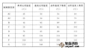 注:表中A1、A2、B、C、D、E、F、G為點型感溫探測器的不同類別,其具體參數應符合附錄一的規(guī)定。