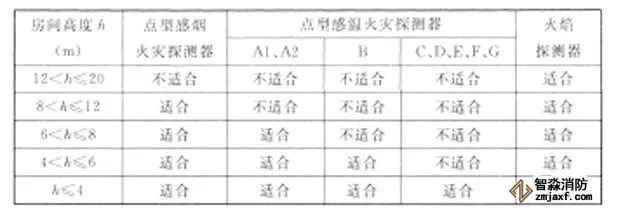 1、對不同高度的房間,可按表1選擇點型火災探測器。