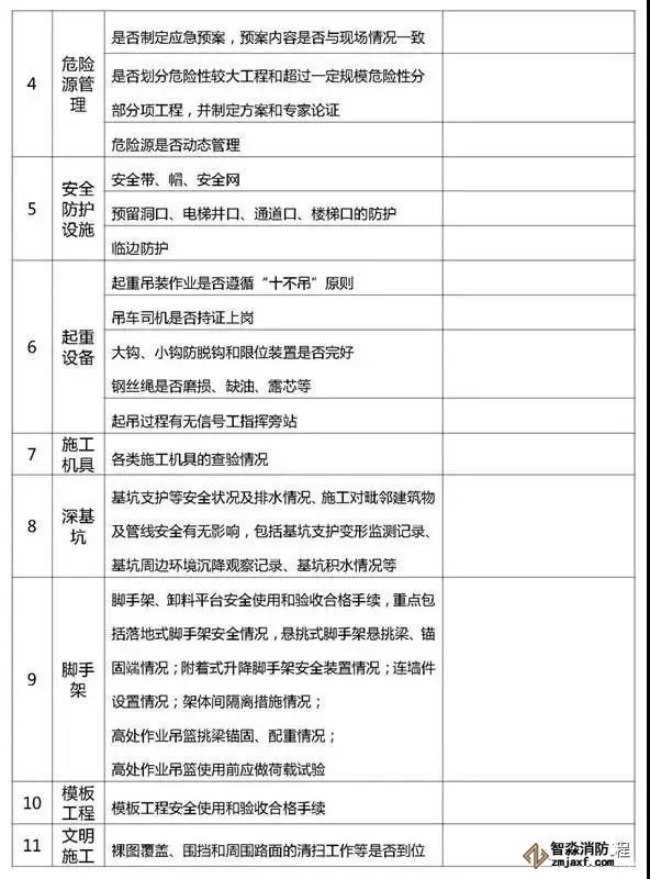 對于春節節后復工檢查,項目部要高度重視,應與監理方組成檢查小組,由項目經理、總監帶隊,對施工現場和生活區逐一檢查,檢查要根據《建筑施工安全檢查標準》(JGJ59-2011)內容要求執行,檢查重點見下表。