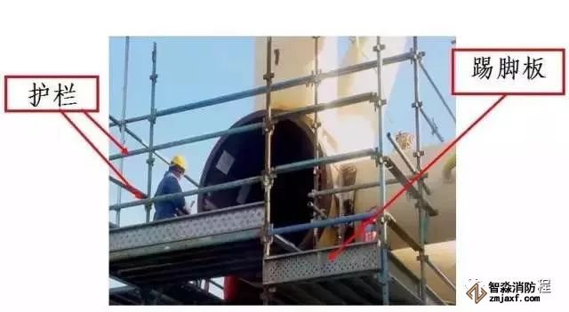 護欄:作業層的外部和端部要有雙層的防護欄桿,防護欄桿高度為1.0-1.2m,靠近底部應有不低于180mm的踢腳板。