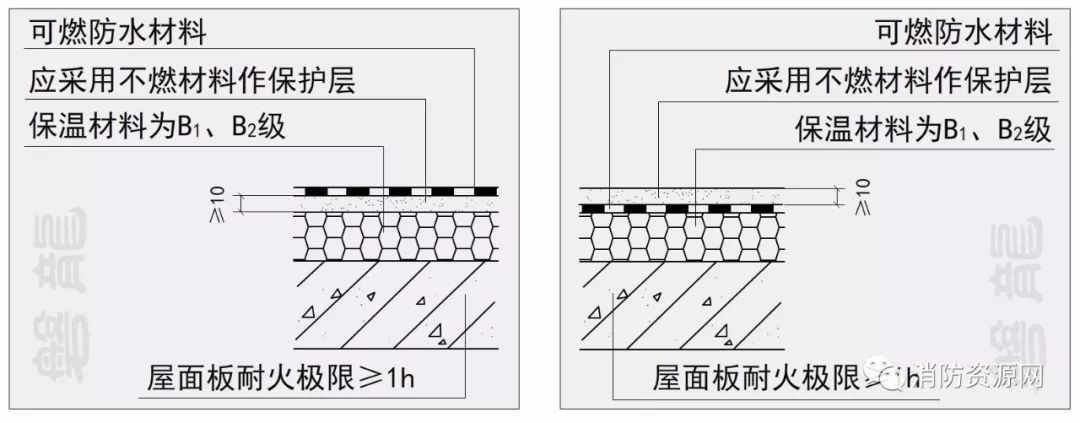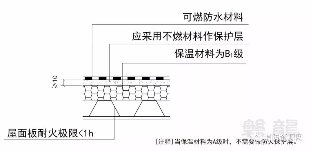 一、建筑的屋面外保溫系統(tǒng),當(dāng)屋面板的耐火極限不低于1.00h時(shí),保溫材料的燃燒性能不應(yīng)低于B2級;當(dāng)屋面板的耐火極限低于1.00h時(shí),不應(yīng)低于B1級。采用B1、B2級保溫材料的外保溫系統(tǒng)應(yīng)采用不燃材料作防護(hù)層,防護(hù)層的厚度不應(yīng)小于10mm。