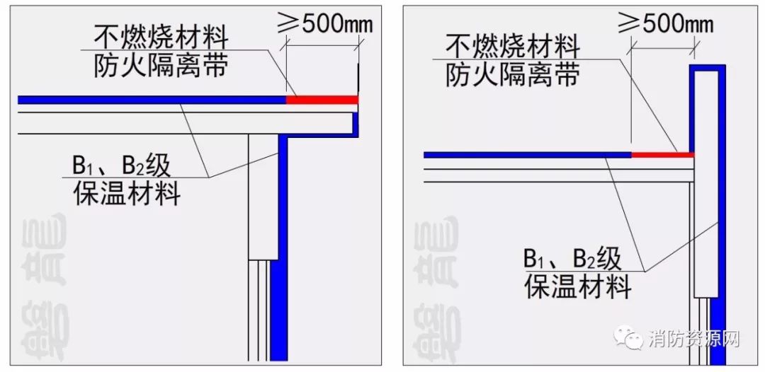 三、建筑的屋面和外墻外保溫系統(tǒng)均采用B1、B2級保溫材料時(shí),屋面與外墻之間應(yīng)采用寬度不小于500mm的不燃材料設(shè)置防火隔離帶進(jìn)行分隔。