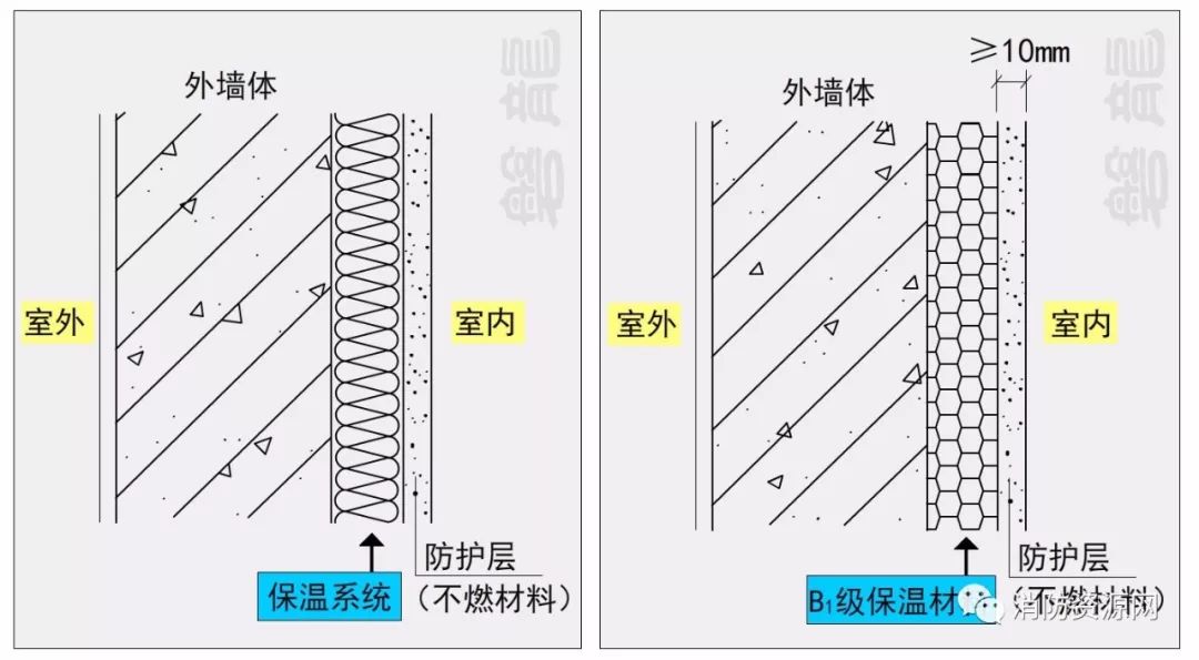2.1、建筑外墻的內(nèi)保溫系統(tǒng),保溫材料設(shè)置在建筑外墻的室內(nèi)側(cè),保溫系統(tǒng)應(yīng)采用不燃材料做防護(hù)層。當(dāng)采用燃燒性能為B1級的保溫材料時(shí),防護(hù)層的厚度不應(yīng)小于10mm。