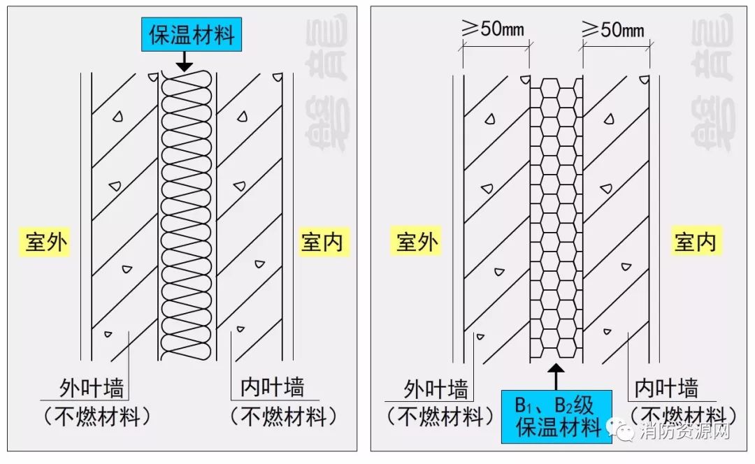 當(dāng)保溫材料的燃燒性能為B1、B2級時(shí),保溫材料兩側(cè)的不燃材料墻體厚度均不應(yīng)小于50mm。