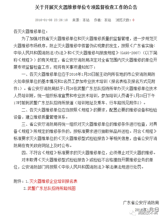 那現在滅火器維修單位的資質如何辦理?這個目前還是個未知之數。以往,滅火器維修單位一直由消防部門監督管理,而廣東消防官網公示的最近一次開展滅火器維修單位專項監督檢查工作是2016年,之后再無更新。