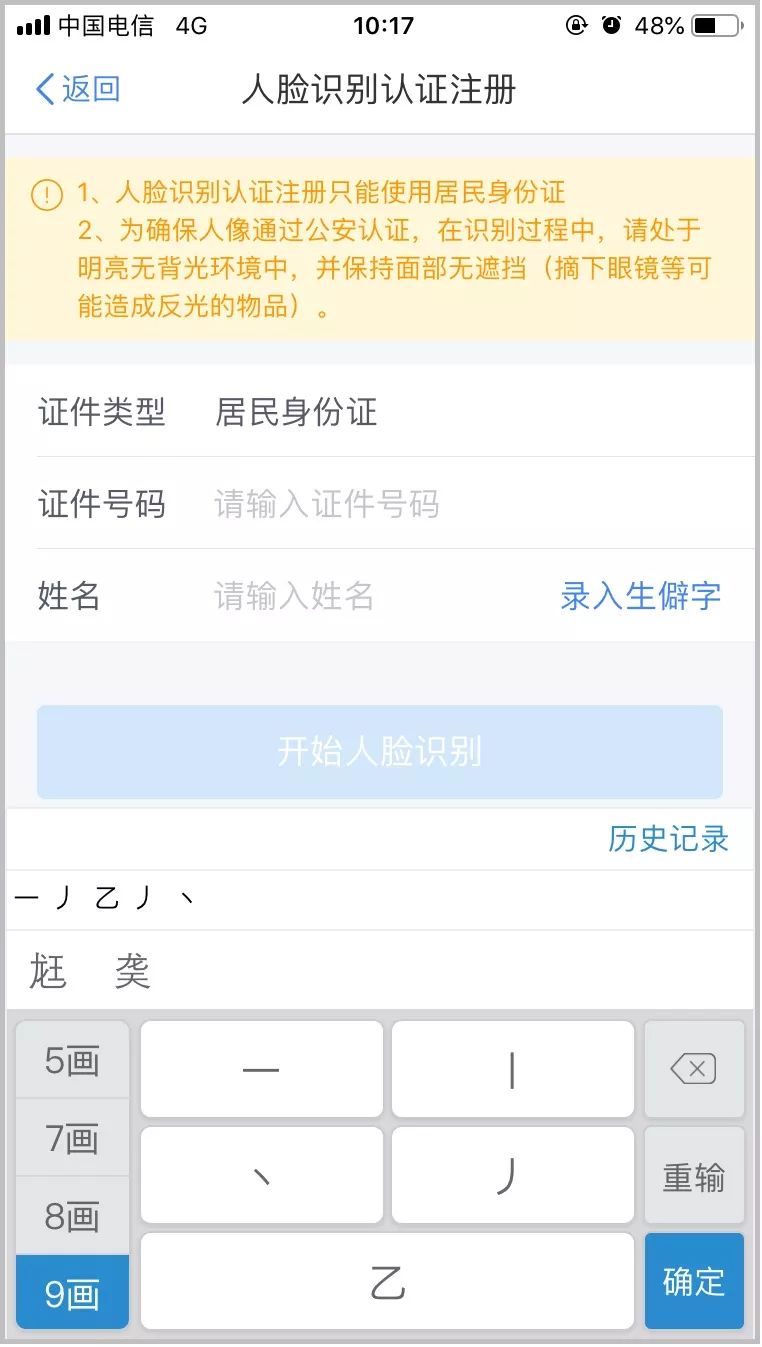4.如實填寫身份相關信息,包括:證件類型、證件號碼、姓名,點擊【開始人臉識別】。若姓名中存在生僻字,可點擊【錄入生僻字】通過筆畫輸入法錄入;