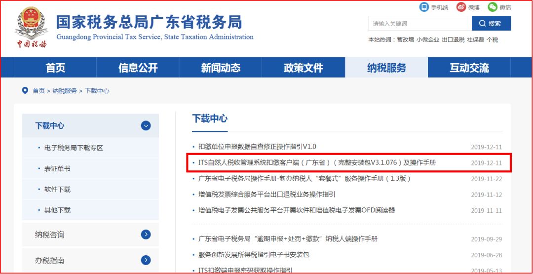 訪問廣東省稅務局門戶網站首頁,依次點擊“納稅服務 > 下載中心 > ITS自然人稅收管理系統扣繳客戶端(廣東省)(完整安裝包V3.1.076)及操作手冊”,如下圖: