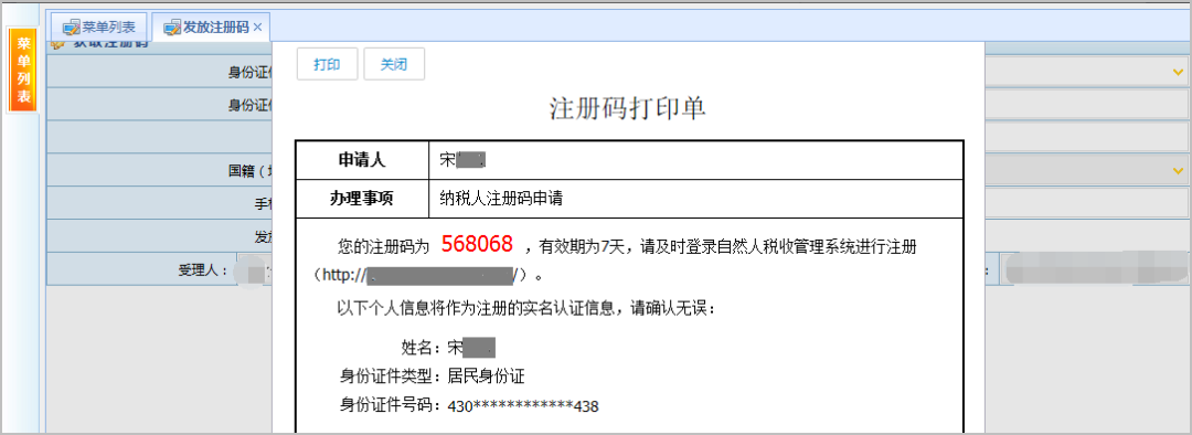 納稅人攜帶本人有效身份證件到辦稅服務廳獲取注冊碼,注冊碼有效期7天(注冊碼由6位的數字、字母隨機組成)。
