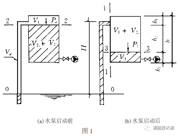 泵啟動后,液面下降,達到穩定運行工作后,罐內應存有一定體積量V3的水,而氣體之外的罐內空氣體積為V1+V2。罐內部的壓力為P1,壓力小于外界大氣壓力Pa。