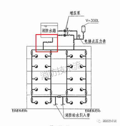 高位消防水箱的主要作用是供給建筑初期火災(zāi)時(shí)的消防用水水量,當(dāng)消防水滅火系統(tǒng)例如室內(nèi)消火栓系統(tǒng)的穩(wěn)壓裝置設(shè)置在高位時(shí),因高位消防水箱經(jīng)過(guò)穩(wěn)壓裝置與消防管網(wǎng)連接,容易漏設(shè)高位水箱的并聯(lián)重力出水管(如下圖)。