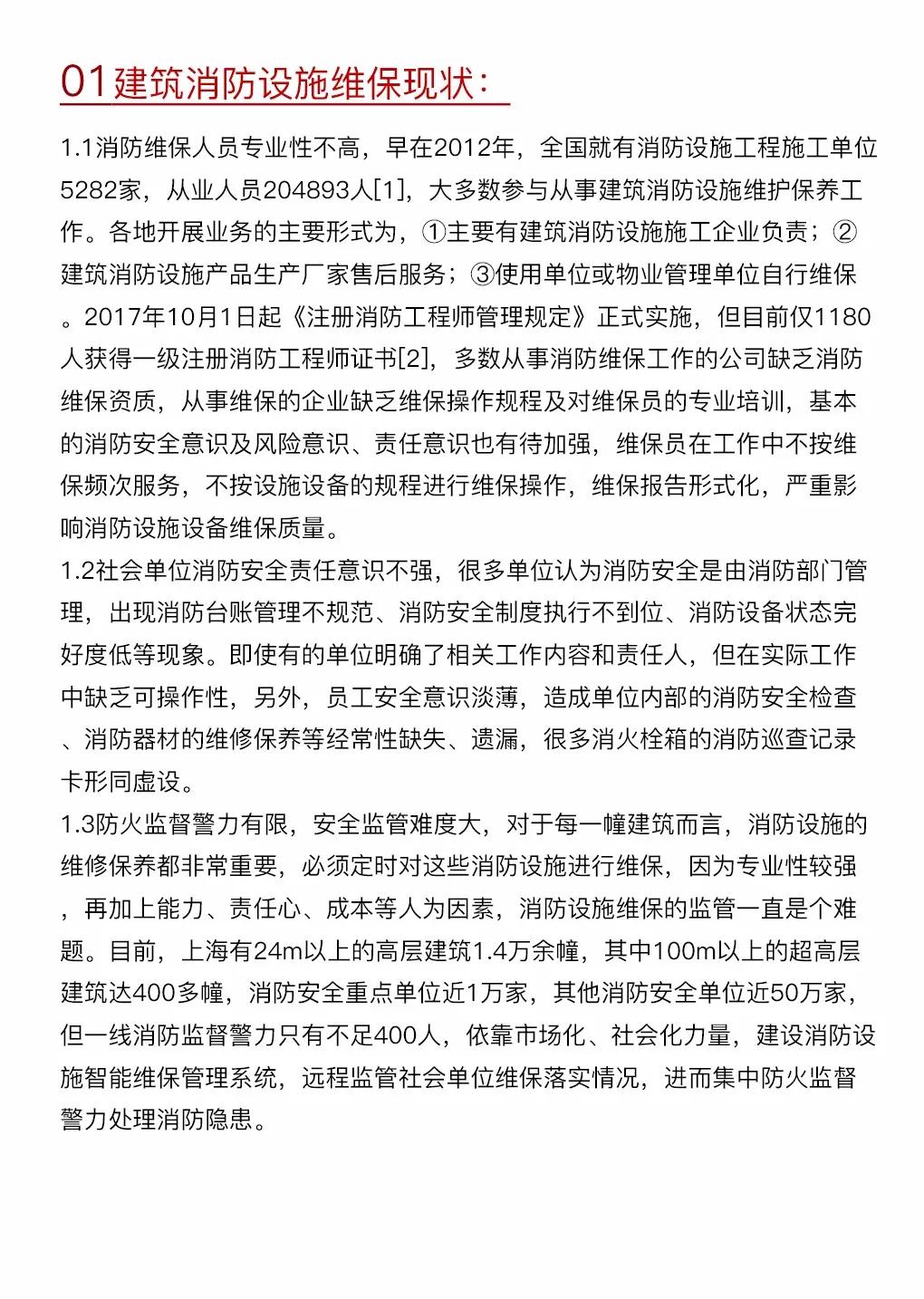 建筑消防設施智能維保管理系統采用無線物聯網、互聯網、近場感應等技術,節省了大量的施工布線成本,改變了傳統消防設施維護保養方式,滿足了社會單位、維保公司和消防主管部門的消防設施管理檢查的需求,符合消防事業的規劃與發展潮流,是社會單位消防安全管理向消防信息化、智能化轉變的模式創新。