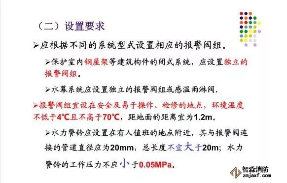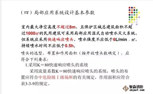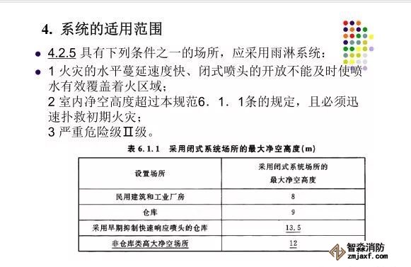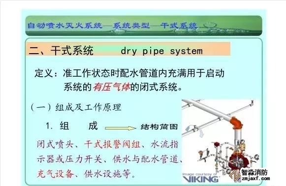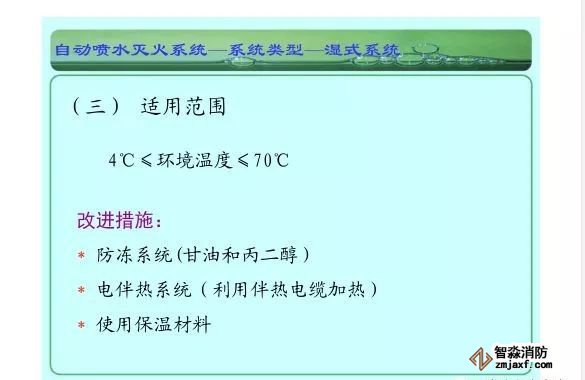 在環境溫度不低于4℃、不高于70℃的建筑物和場所(不能用水撲救的建筑物和場所除外)都可以采用濕式系統。該系統局部應用時,適用于室內較大凈空高度不超過8m、總建筑面積不超過1000㎡的民用建筑中的輕危險級或中危險級Ⅰ級需要局部保護的區域。3.濕式系統特點:①.結構簡單,使用可靠②.系統施工簡單、靈活方便